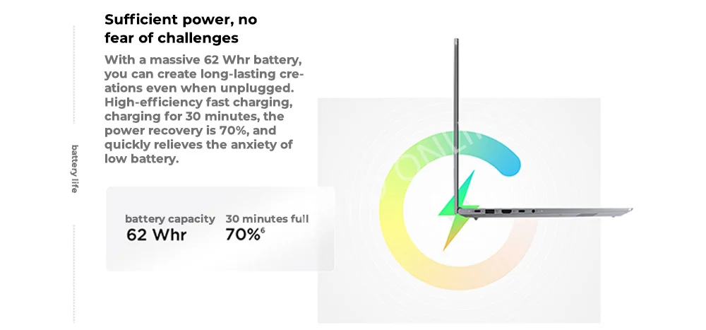 With a massive 62 Whr battery,you can create long-lasting cre-ations even when unplugged.High-efficiency fast charging,charging for 30 minutes, thepower recovery is 70%,andquickly relieves the anxiety oflow battery.
