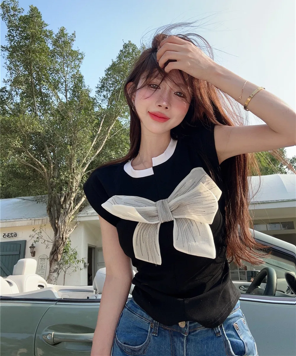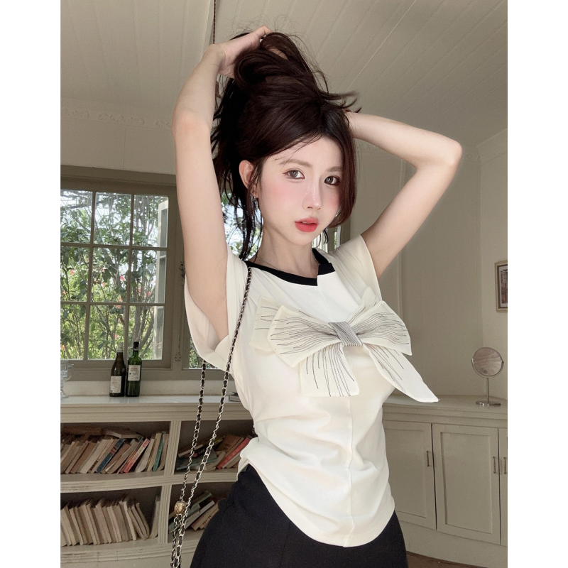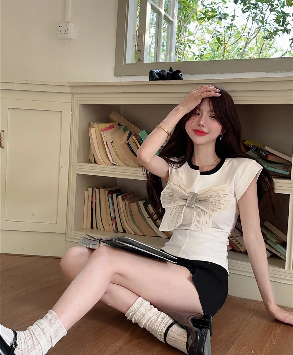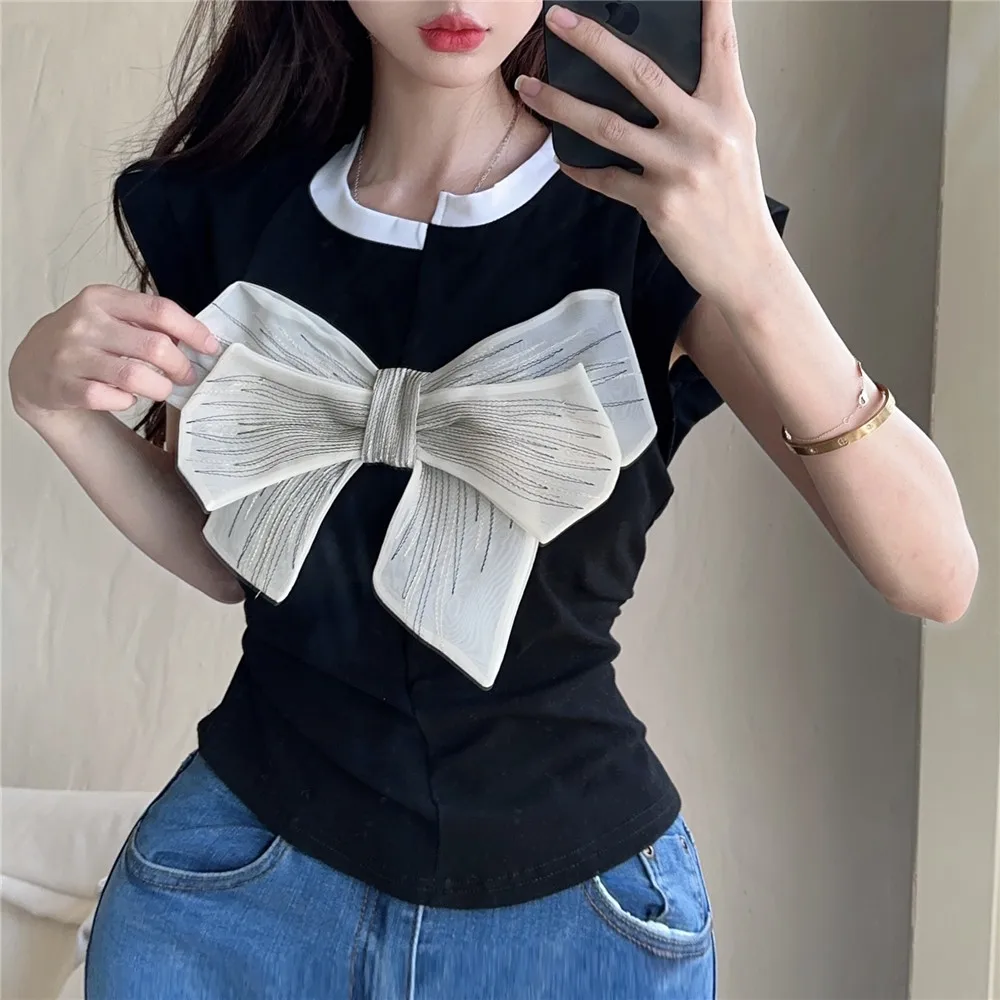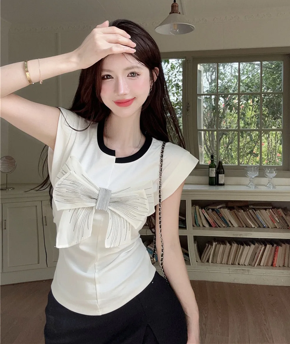 T Shirt For Women Short Sleeve Solid White Bow Personalized Trend Chic Vintage Fashion Summer Female Clothing Versatile Y2K Tops
