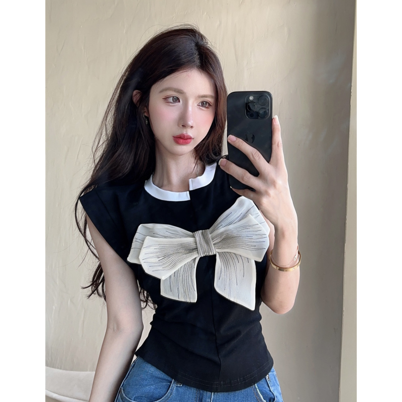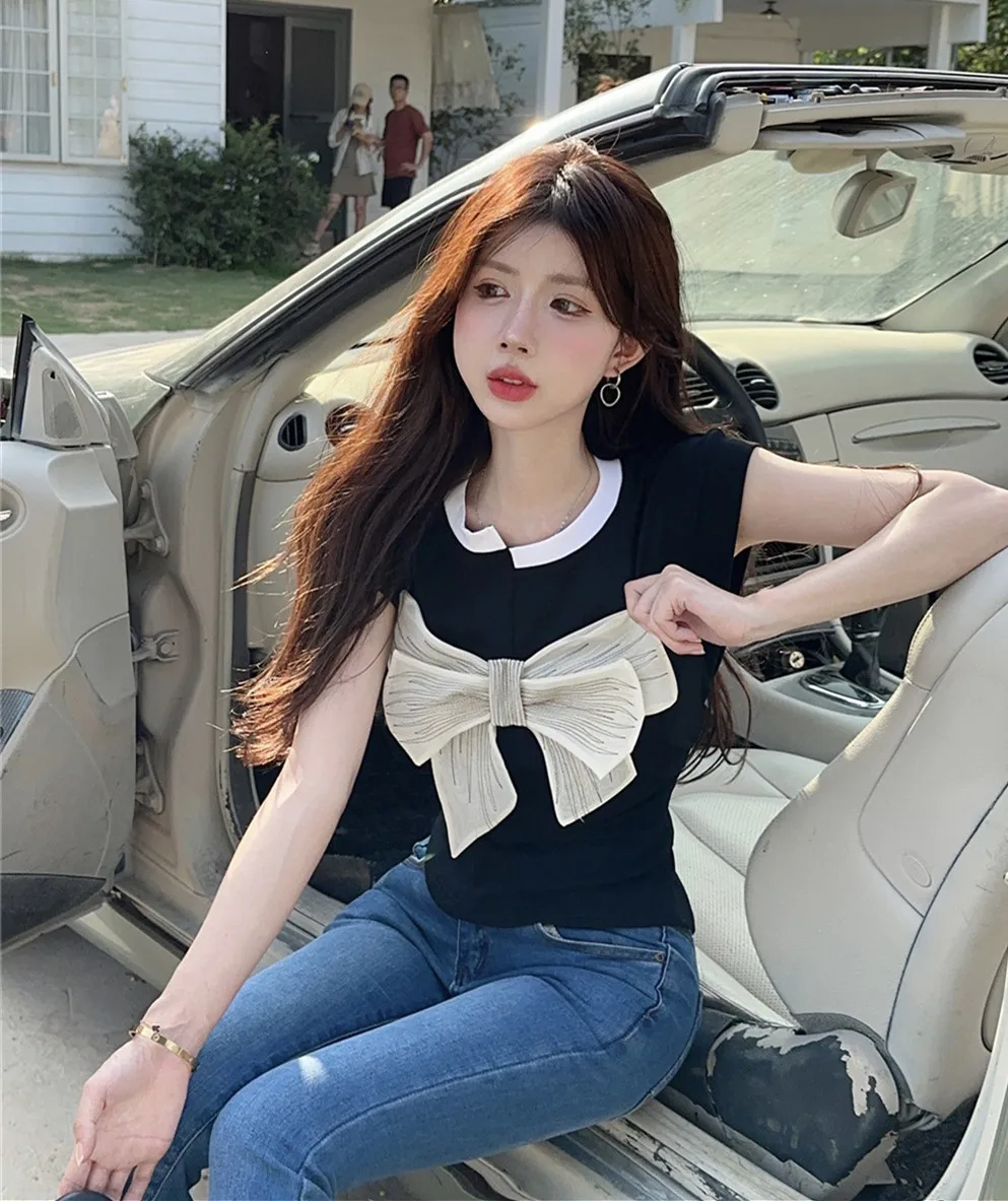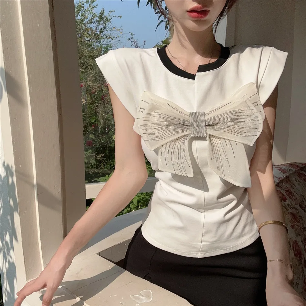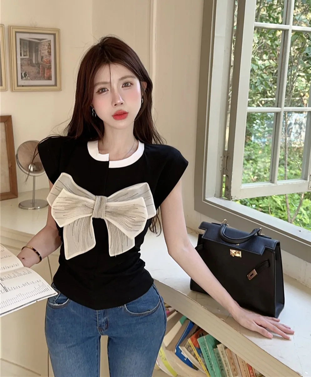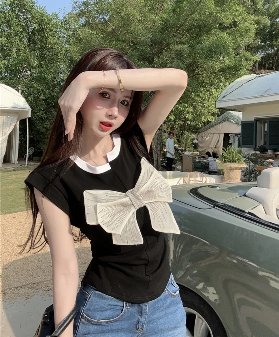 T Shirt For Women Short Sleeve Solid White Bow Personalized Trend Chic Vintage Fashion Summer Female Clothing Versatile Y2K Tops