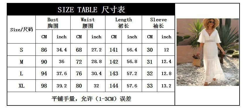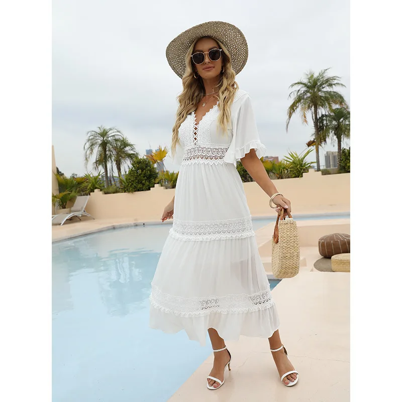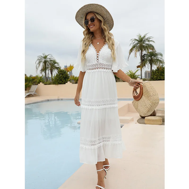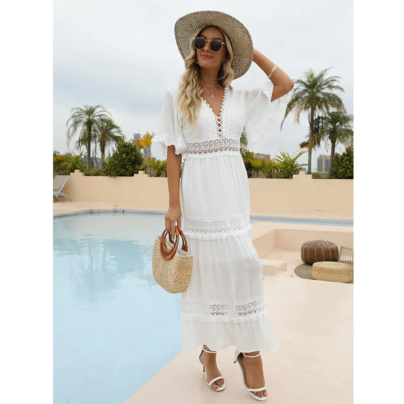 White Chiffon Long Dress Women Summer Beach Dress Female Lace Hollow Out Sundress Ladies V Neck Short Flare Sleeve Dress