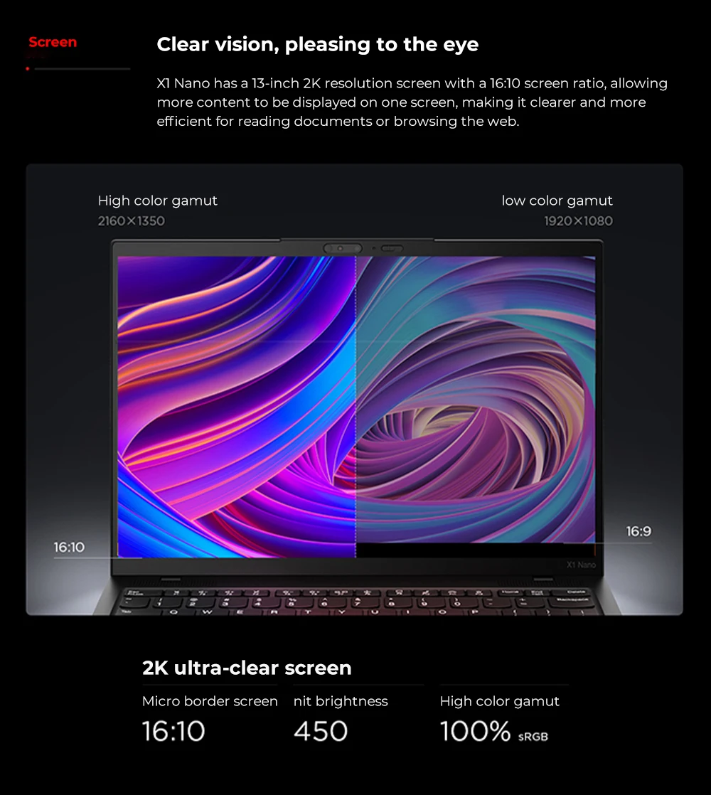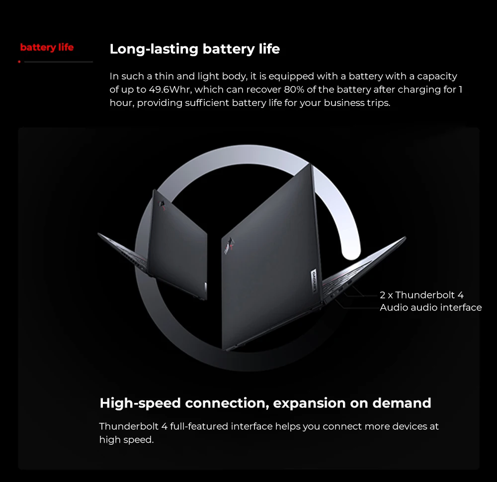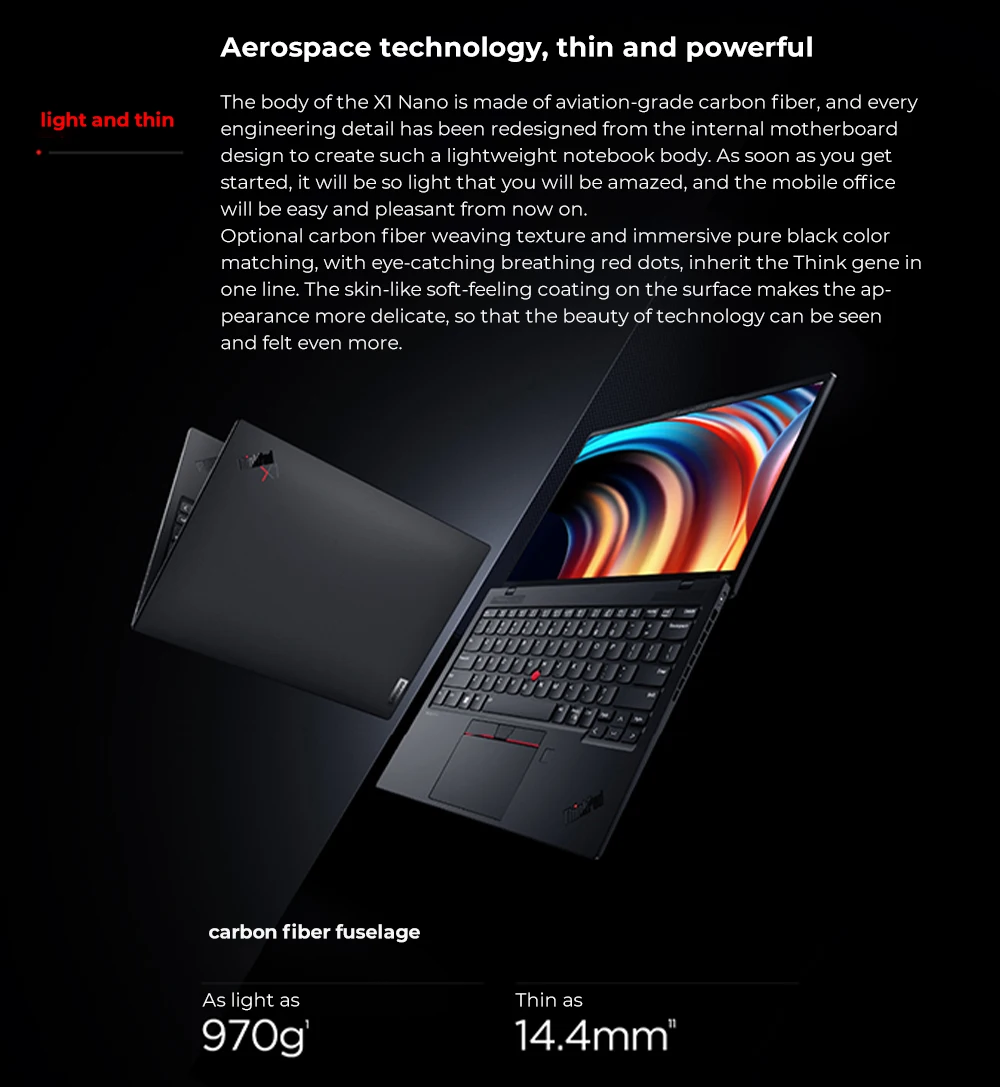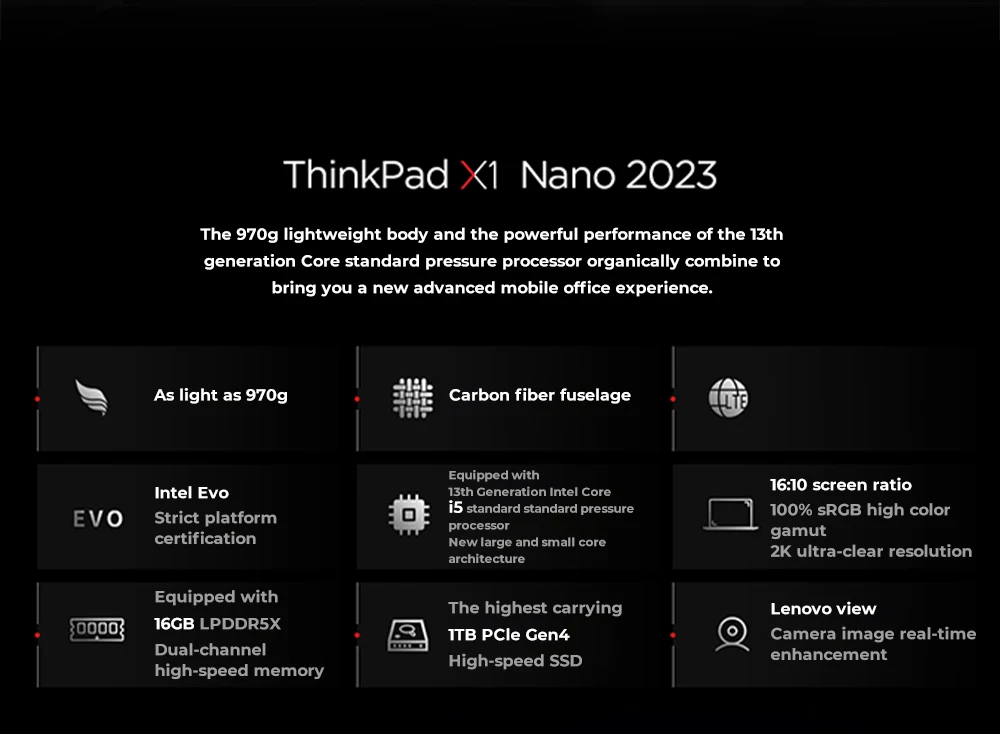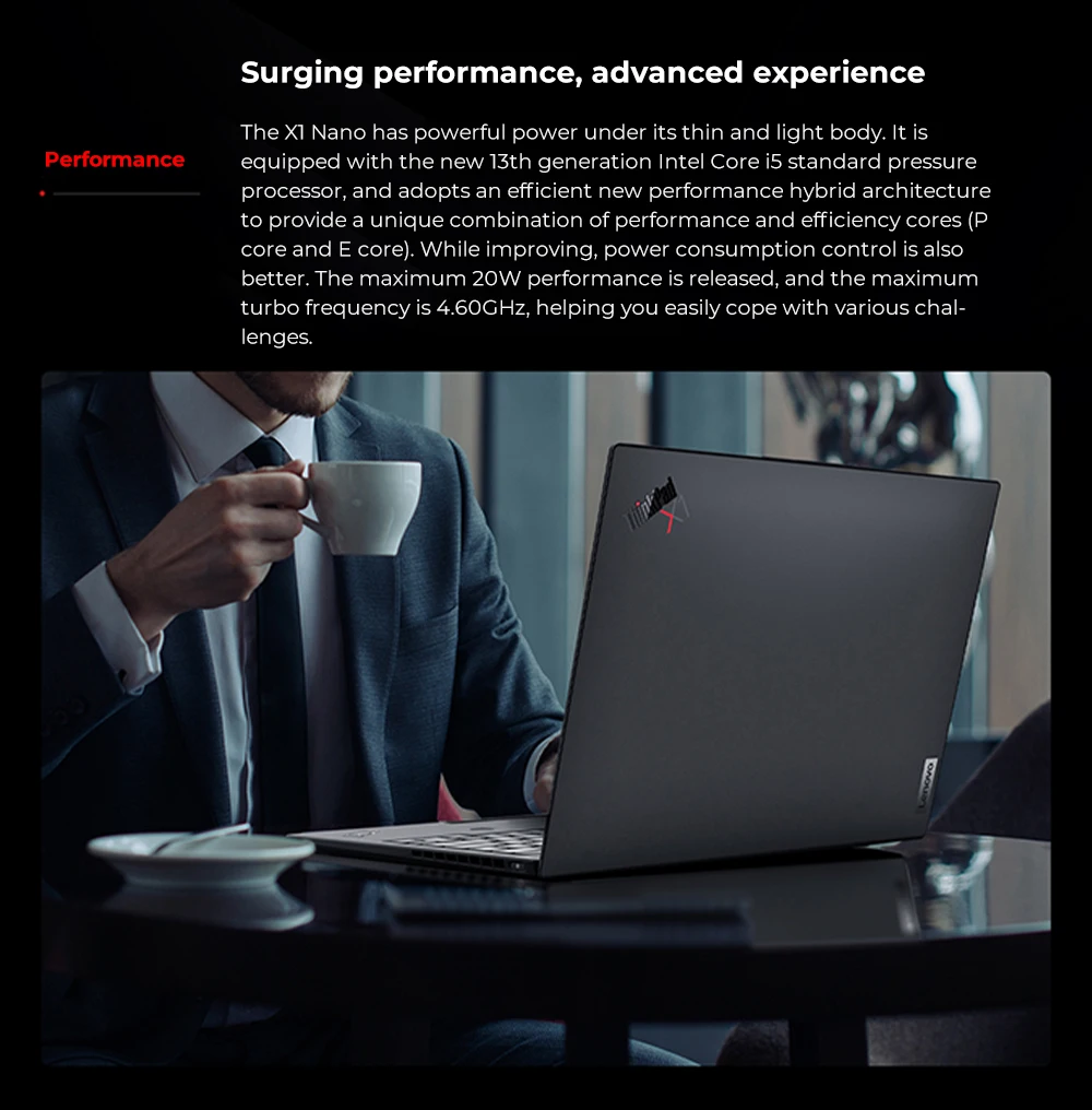 The X1 Nano has powerful power under its thin and light body. It is equipped with the new 13th generation Intel Core i5 standard pressure