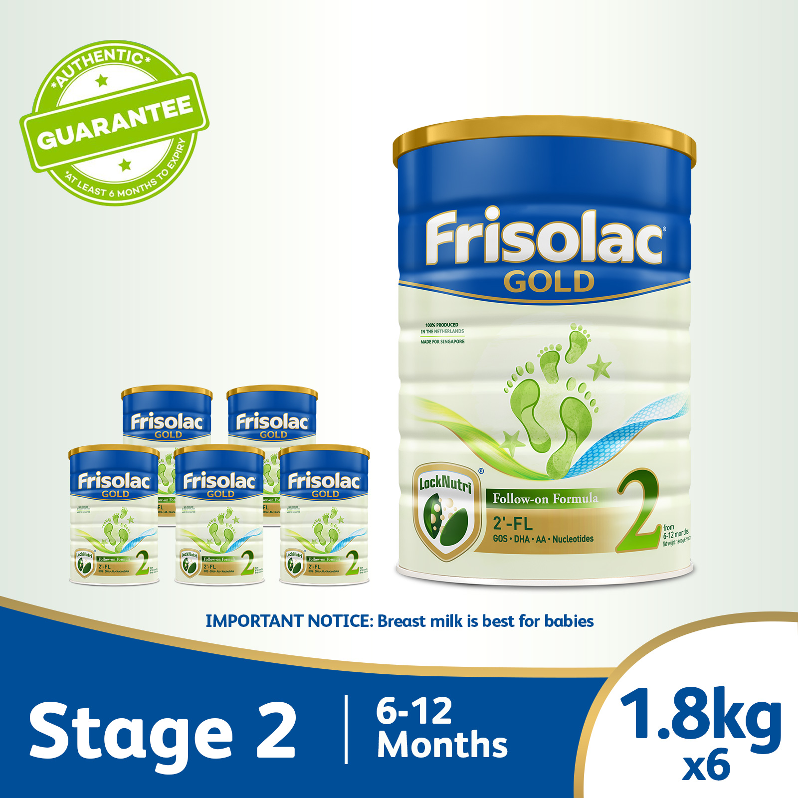 Frisolac Gold Stage 2 with 2'-FL 1.8kg - Follow-On Milk Formula Powder - For Infant / Newborn / Baby 6-12 months old (Bundle of 6)